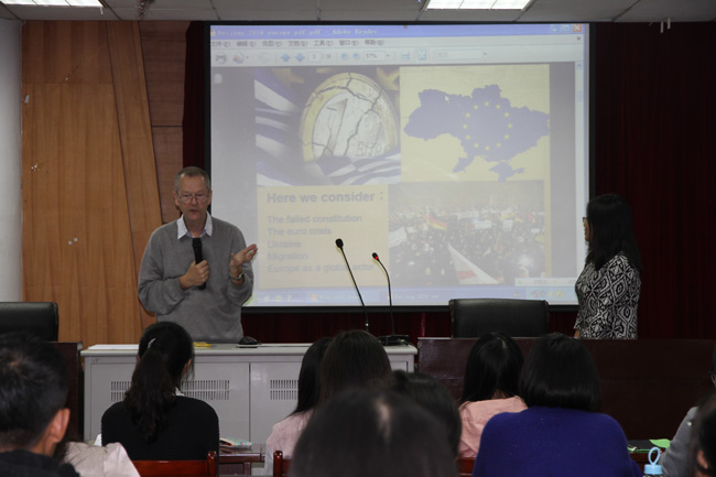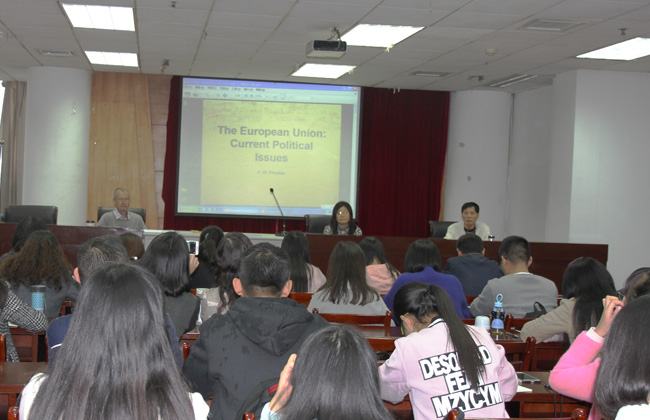 报告会上,Peter教授在肯定欧盟在过去几十年所取得的成就的基础上,强调指出近年来欧盟实际上“危机四伏”。他随后结合欧盟制度架构、欧债危机、乌克兰问题、移民问题、英国脱欧、欧盟在全球事务中所扮演的角色等,进行了多层次、多角度的深入剖析,并对欧盟发展前景进行了分析和展望。报告会现场气氛热烈,Peter教授严谨的思维、风趣幽默的表达,分析问题的深入浅出,让与会师生受益匪浅,赢得阵阵热烈掌声。董德福院长最后作了简要点评,并就进一步深化国际交流与合作、大力推进学院国际化工作、不断提升办学治院和人才培养水平提出明确要求。报告会后,部分师生意犹未尽,纷纷结合各自关心的问题与Peter教授作了场外交流。应学院邀请,10月25~27日,Peter Wallace Preston先生对我校进行了学术访问交流。 (永利3044集团) |