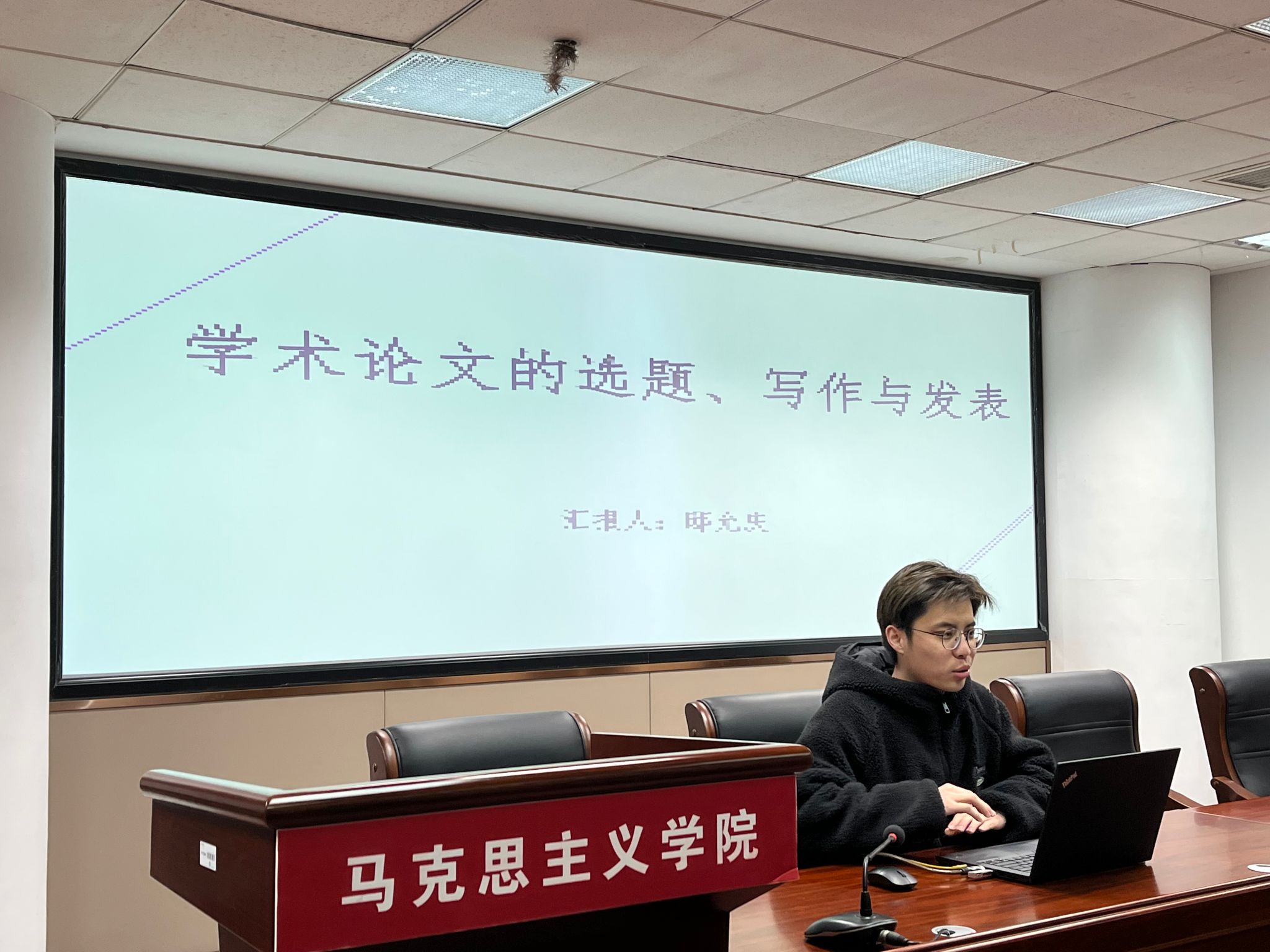 活动开始,两位同学轮流上台就学术研究以及论文检索、撰写、发表等内容与大家分享经验。齐培全从未来目标规划、具体应该如何做、论文的“读写投”问题三个方面展开介绍。建议同学们要对自己未来的目标有清晰的规划,想清楚是继续深造还是考虑就业。其次建议大家在认真学习专业课的同时也要多关注热点问题,注重阅读积累,加强论文写作的知识储备。最后,齐培全为大家介绍了发表记、万维书刊网等一些论文投稿发表的网站,他表示关于“读写投”的问题,同学们要善于发现议题,找到合适的切入点,注重文献综述的写作。