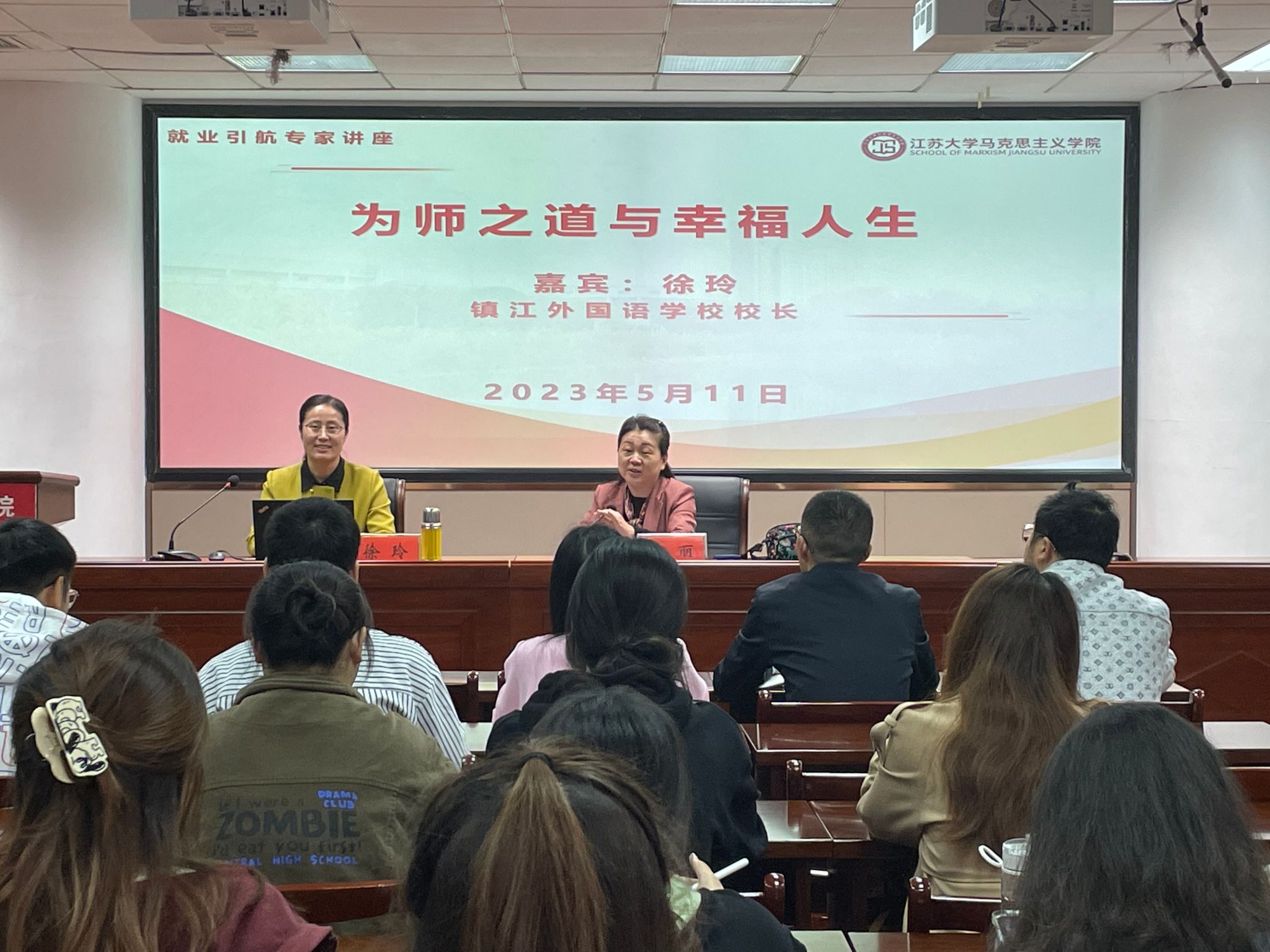 5月11日上午,永利3044集团在三江楼1701报告厅举办“为师之道与幸福人生”师范生就业育人主题讲座。讲座由李丽院长主持,学院校友、镇江市外国语学校校长徐玲老师受邀担任主讲嘉宾,学院副院长蒋俊明、部分青年教师和本研学生参会。