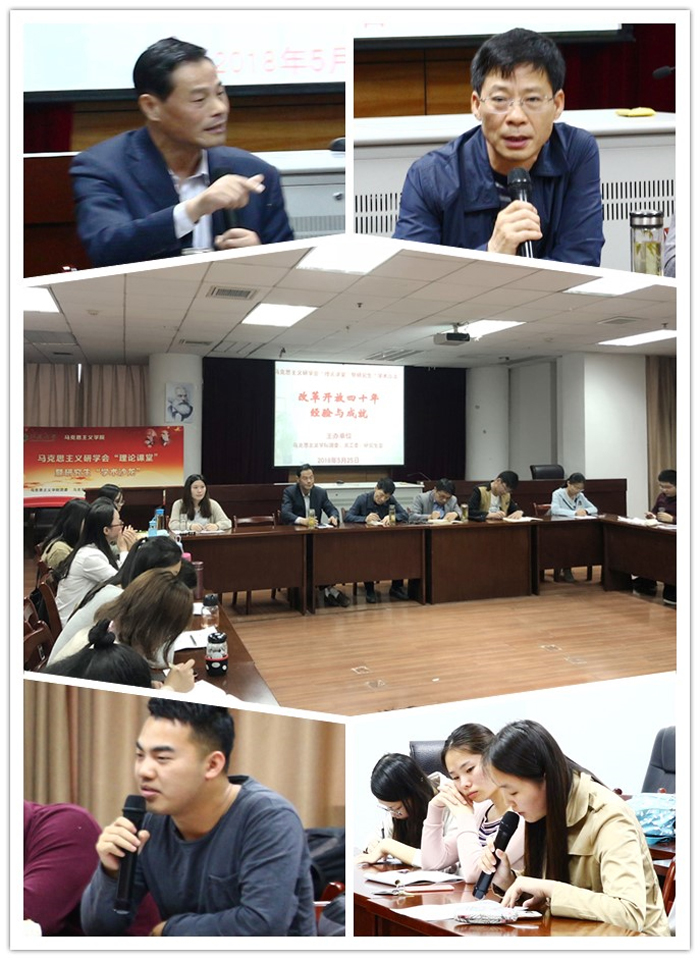 随后,堵老师用幽默风趣的语言,结合自己的人生经历,从改革开放的历史背景、重大成就以及经验教训三个方面,跟同学们分享了自己的心得体会。董院长在讲话中首先推荐大家认真研读习近平总书记在纪念马克思诞辰200周年纪念会上的讲话。他认为,研究四十年来的改革和开放可以从“宏观”、“微观”及“理论和实际相结合中理性思考”这三个方面展开,“改革开放的必然性”、“改革开放如何全方位转型升级”、“改革开放再出发,如何坚持马克思主义的指导”、“新时代如何坚持和发扬改革开放”是值得大家进一步思考和研究的问题。蒋老师最后对同学们的发言进行了点评。