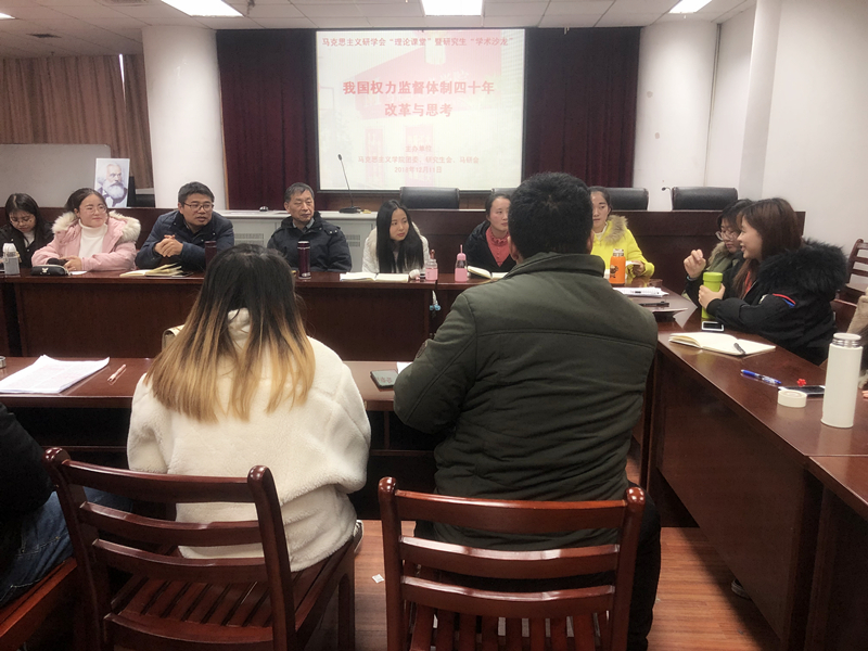 活动伊始,主持人对本次学术沙龙的主题、举办的背景及其意义进行了简要介绍,紧接着程天宇、芮亚兰、孙腾、路通、朱小颖、恽桃、刘敏敏、冯福军等同学结合自身专业,在梳理我国40年来权力监督体制改革历程的基础上,分别从我国权力监督体制的哲学价值、舆论监督的现状和未来、群众监督权力的体制沿革、网络监督的优势及国家监察体制的形成和特点等方面发言。活动进行中,还就我国权力监督体制的特点和优势、中西方权力监督比较、权力监督不同方式之间的内在关系等问题进行了互动交流。