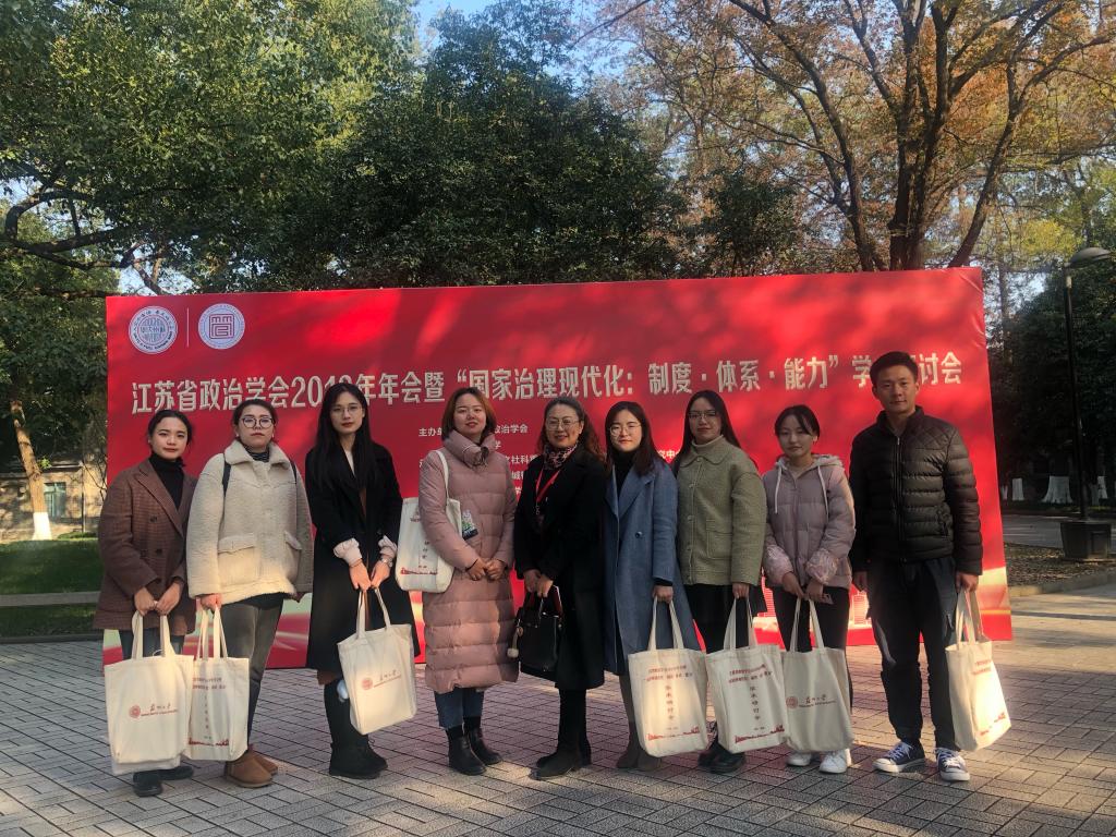 12月7日,由江苏省政治学会、苏州大学主办的江苏省政治学会2019年会暨“国家治理现代化:制度、体系、能力”学术研讨会在苏州大学红楼学术报告厅召开,来自南京大学、东南大学、永利集团、苏州大学、南京审计大学等国内高校的众多师生参加了此次研讨会。我院金丽馥教授携2018级研究生王婕、吴琳华、黄继衡以及2019级研究生袁琪、张悦、王艺琳、许慧琳、朱敏等八位同学参加此次学术研讨,围绕会议主题提交论文且入选论文集,同时在各分论坛积极进行论文汇报。