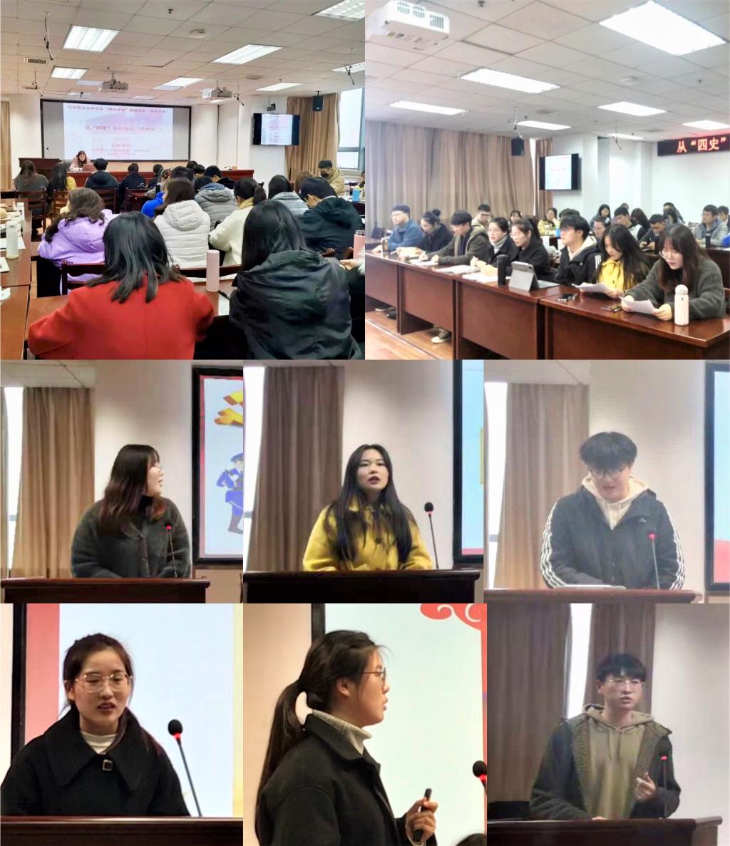 活动伊始,主持人对本次学术沙龙的主题、举办背景和意义进行简要的介绍,接下来王敏同学就当代青年为什么和怎么样学好“四史”、如何学好“四史”进行了阐述;程莎莎同学主要围绕中国共产党的发展史,论述了学好党史的重要性;张逸霄同学主要围绕“四史”中如何坚持理论与实践相结合这一论点展开;司琼琼同学以陈望道的故事切入,论述了真理的味道为什么“非常甜”;孙萌同学讲述了如何在“四史”中把握历史规律,汲取经验智慧,增强历史担当;蒋瑞同学就“四史”与人民的关系展开论述,说明了人民性是马克思主义最鲜明的品格。六位同学结合其专业理论与同学们展开讨论,参会同学认真听讲思考并现场互动。