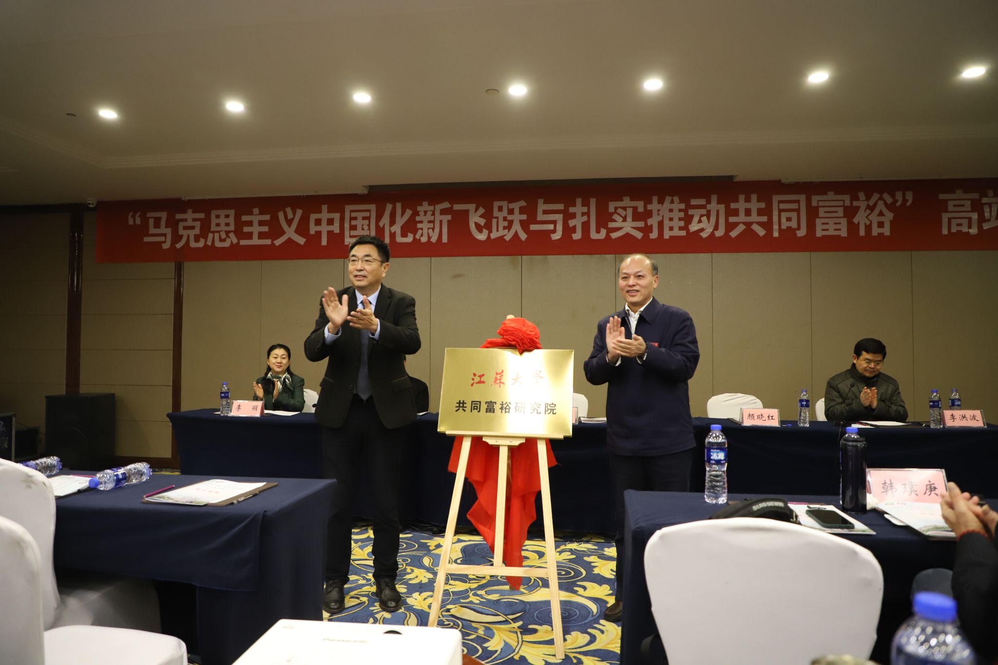 1月9日,“马克思主义中国化新飞跃与扎实推动共同富裕”高端论坛暨永利集团共同富裕研究院揭牌仪式在镇江举行。江苏省社科联党组书记、常务副主席张新科,永利集团校长颜晓红为“共同富裕研究院”揭牌并致辞。中国社科院马克思主义研究院党委书记、副院长、中国社科院大学永利3044集团院长辛向阳,浙江工商大学校长、浙江大学社会治理研究院院长郁建兴,中共中央党校永利3044集团院长张占斌,江苏省社科院党委委员、副院长王月清,镇江市社科联党组书记、主席于伟,《马克思主义研究》编辑部副主任张建刚,《江海学刊》原主编韩璞庚、副主编战炤磊,永利3044集团院长、共同富裕研究院执行院长李丽等出席会议。马克思主义理论学科国内知名专家、江苏省委党校和省内永利3044集团的部分院长,以及永利3044集团、管理学院、法学院、财经学院、新农村发展研究院等单位的专家和师生代表参加论坛。永利集团党委副书记、共同富裕研究院院长李洪波主持揭牌仪式。