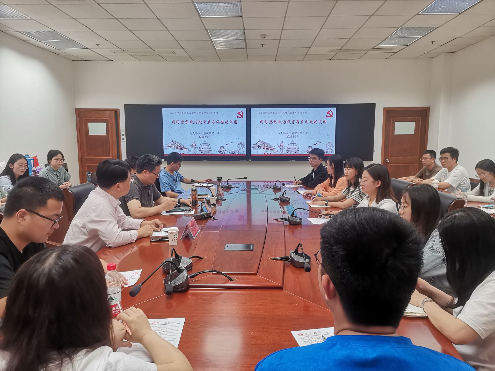5月20日下午,永利3044集团于三江楼1706开展主题为“网络思想政治教育存在问题的成因”学术沙龙。校学工处处长杨道建、学院副院长蒋俊明与兼职辅导员孙旭红受邀参加此次活动,全体2021级硕士研究生参会,活动由梁宇睿同学主持。
