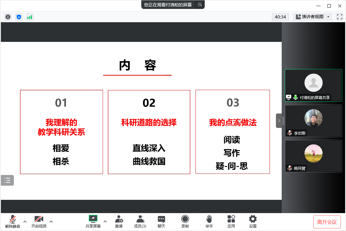 主讲结束之后,诸位与谈人围绕教学和科研的关系展开了热烈的讨论。肖建国副教授就如何站稳讲台、履行岗位职责、个人与集体协同发展等问题分享了自己的见解;孙旭红副教授围绕如何处理教与学的矛盾关系,树立正确的教学态度等问题阐述了自己的看法;李春建副教授则针对青年教师在教学和科研中可能存在的困惑,提出“以赛促教”,认为要对课堂教学常存敬畏之心,并分享了自身课题申报的宝贵经验。