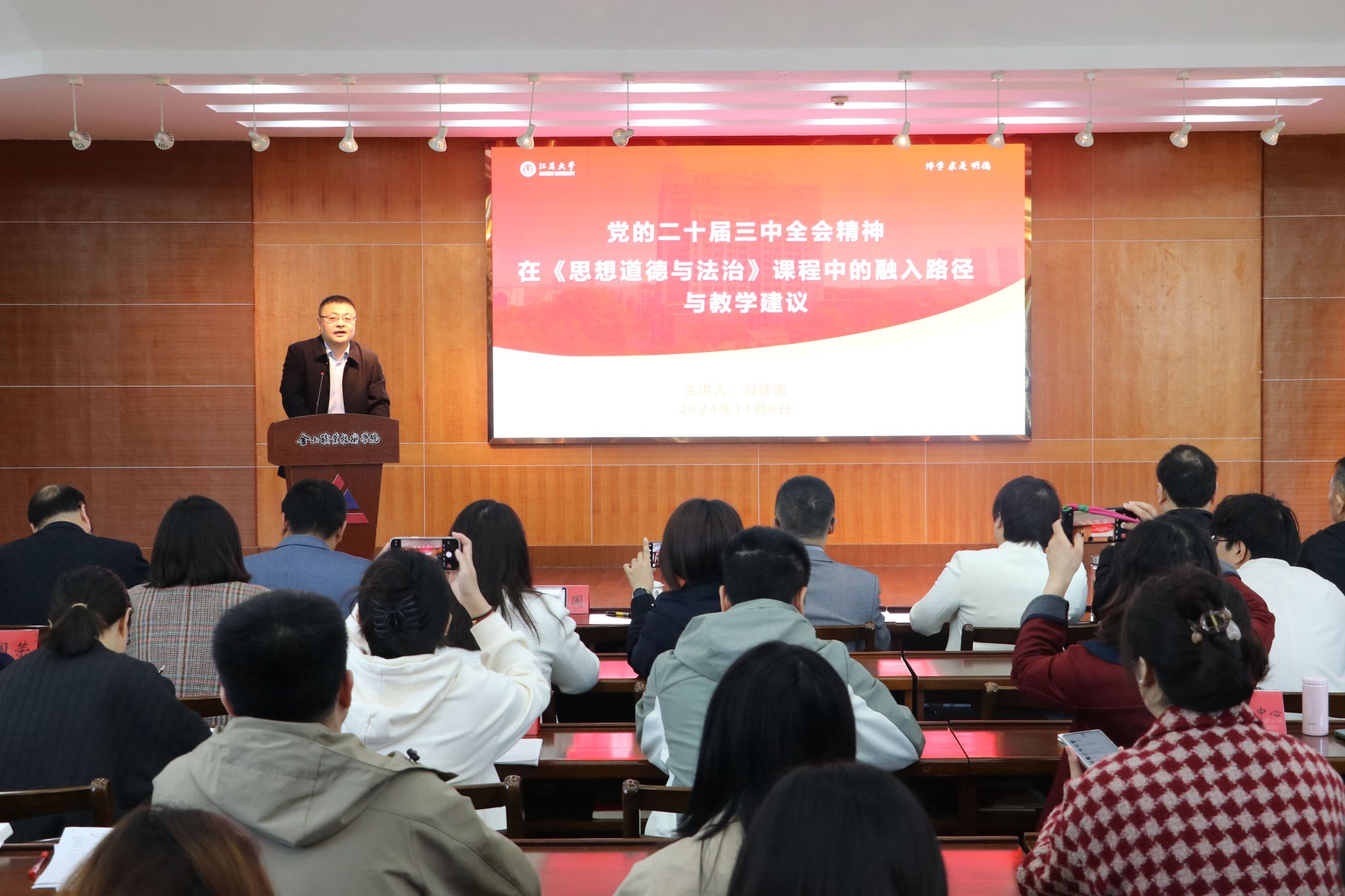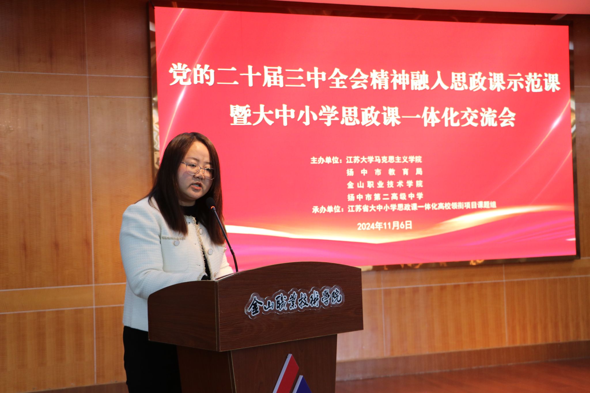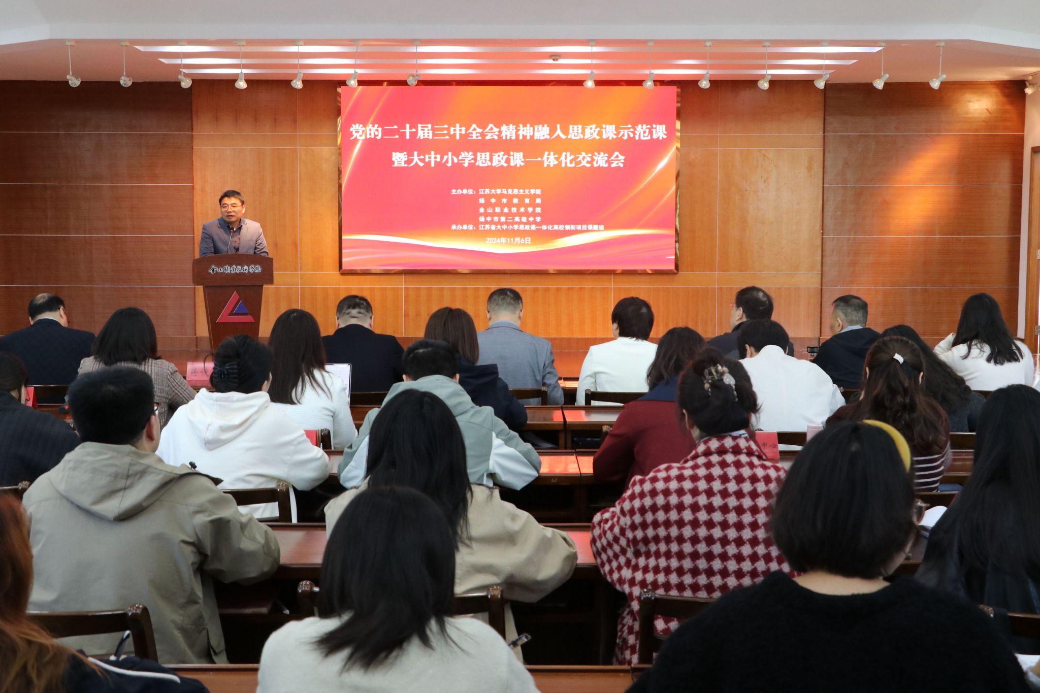 为深入贯彻落实习近平总书记关于学校思政课建设的重要指示精神,推动党的二十届三中全会精神全面融入思政课堂,促进大中小学思政课一体化高质量发展,11月6日上午,“党的二十届三中全会精神融入思政课示范课暨大中小学思政课一体化交流会”在金山职业技术学院图书馆三楼会议室隆重举行。本次交流会由永利集团、扬中市教育局、金山职业技术学院和扬中市第二高级中学联合主办,江苏省大中小学思政课一体化高校领衔项目(永利集团)课题组承办。永利3044集团副院长蒋俊明教授主持了活动。
