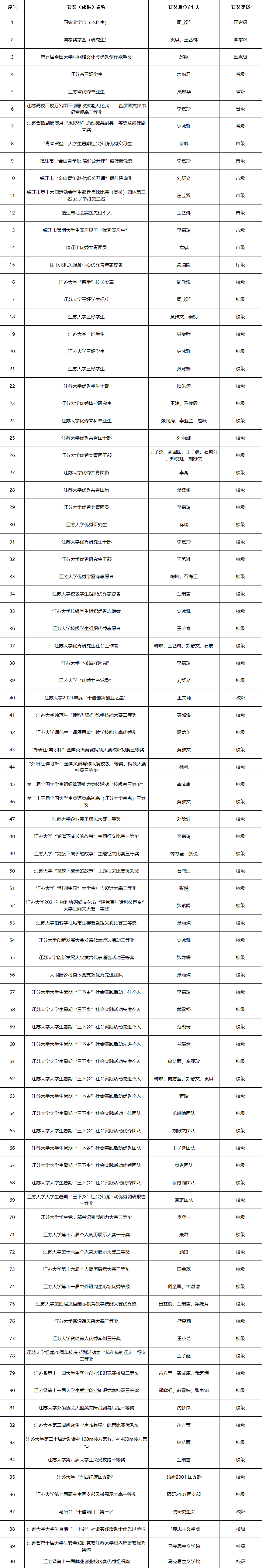 2021年度学生工作和共青团建设主要获奖(成果)